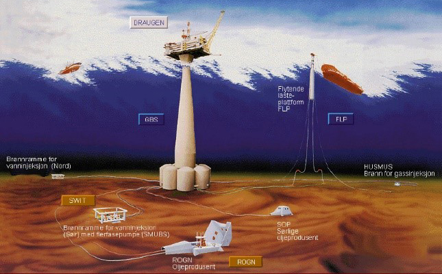 Et av konseptene det ble jobebt med for å finne beste løsning for Draugenfeltet. Illustrasjon: A/S Norske Shell