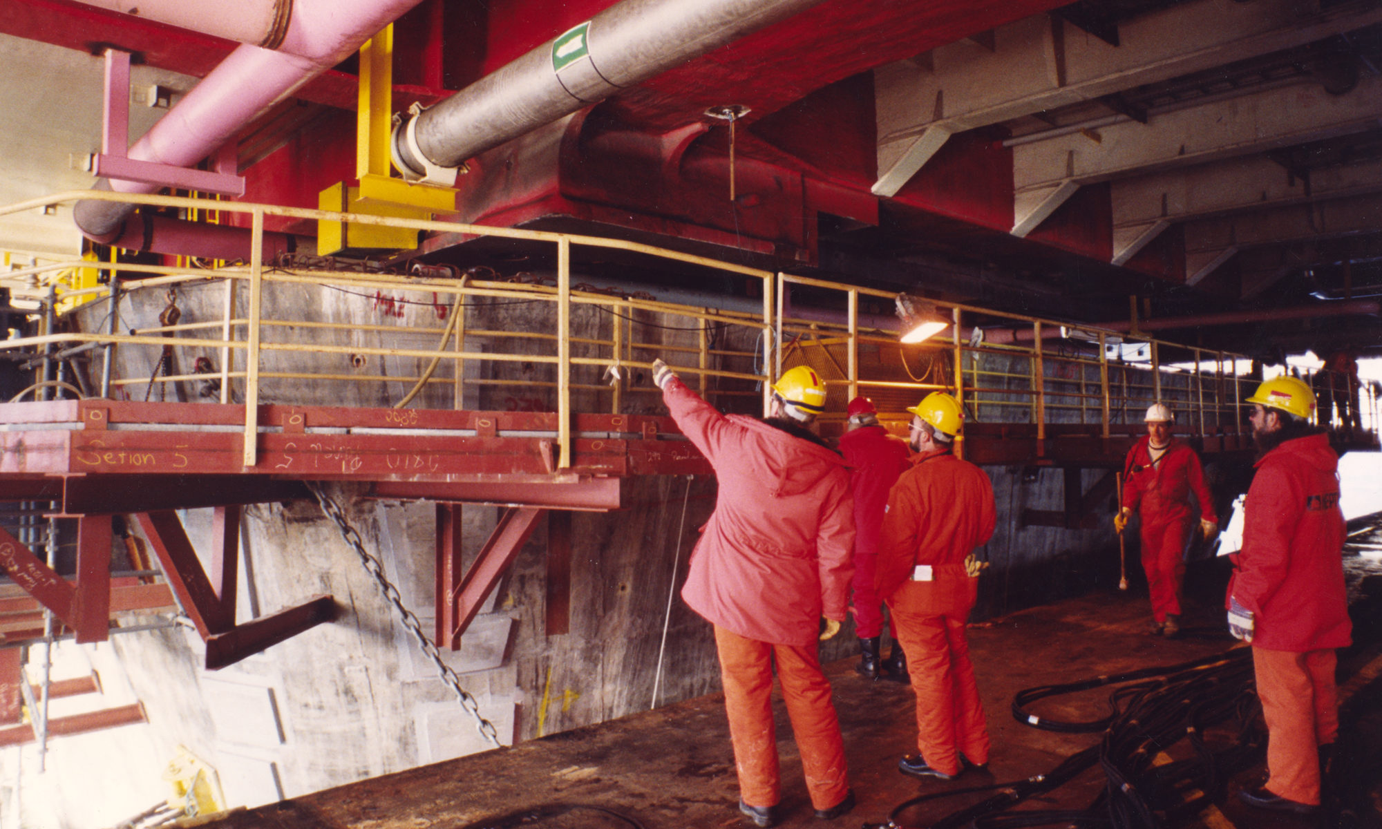 Det var en enorm spenning da betongunderstellet ble senket nedover for at dekket, som var plassert på lekterne, skulle flyte over. Bare fire meter av betongstrukturen var over vann da lekterne med dekket kastet loss og beveget seg sakte over understellet.